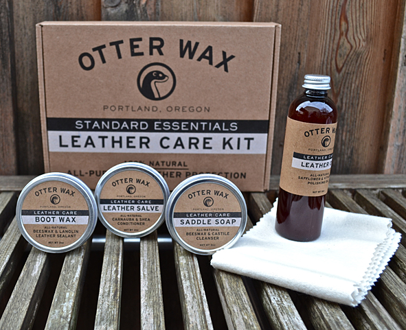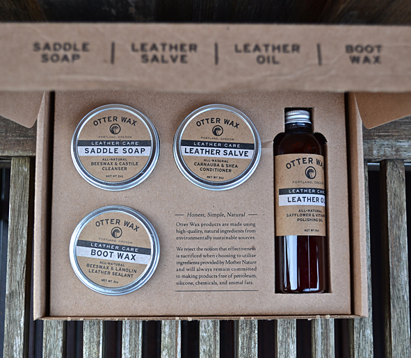 What a nice box design and even better the content – 4 OTTER WAX products for your boots, leather jackets, belts, for really everything made of leather: Saddle Soap, 2oz, Leather Salve, 2oz, Leather Oil, 5oz, Boot Wax, 2oz, Flannel Buffing Cloth. So this kit contains all 4-Steps to comprehensive leather care! All products are made with natural ingredients to ensure that they work with all types of leather. Made in Portland, Orgeon.